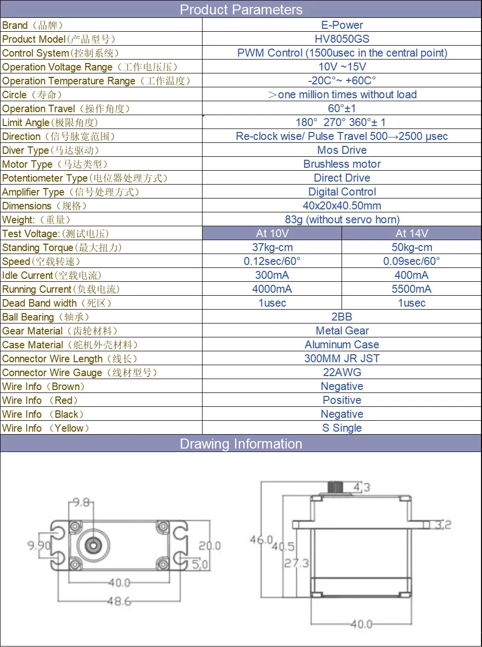 Сервопривід E-Power Waterproof BLS-HV8050GS 14V 50KG 180°/270°/360°